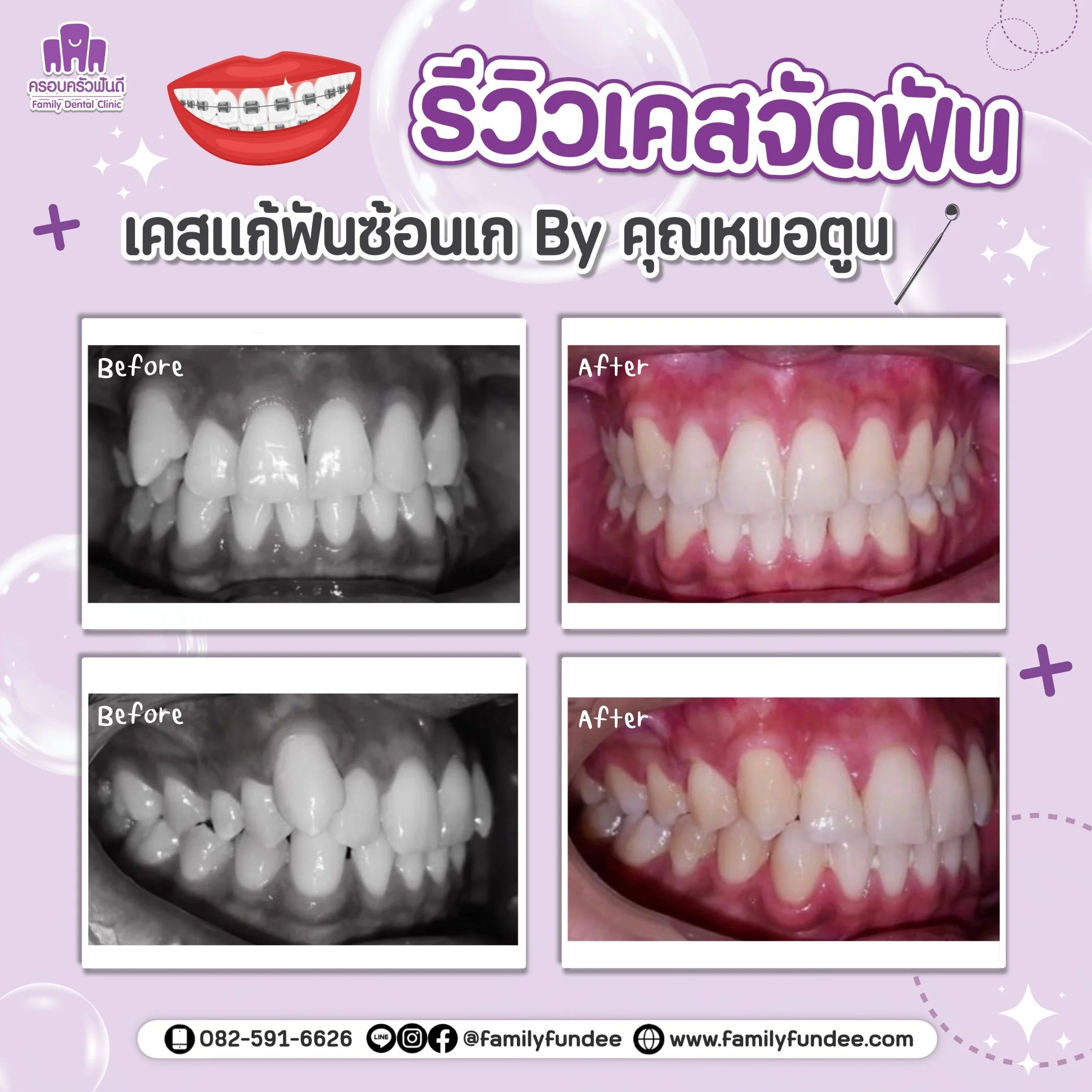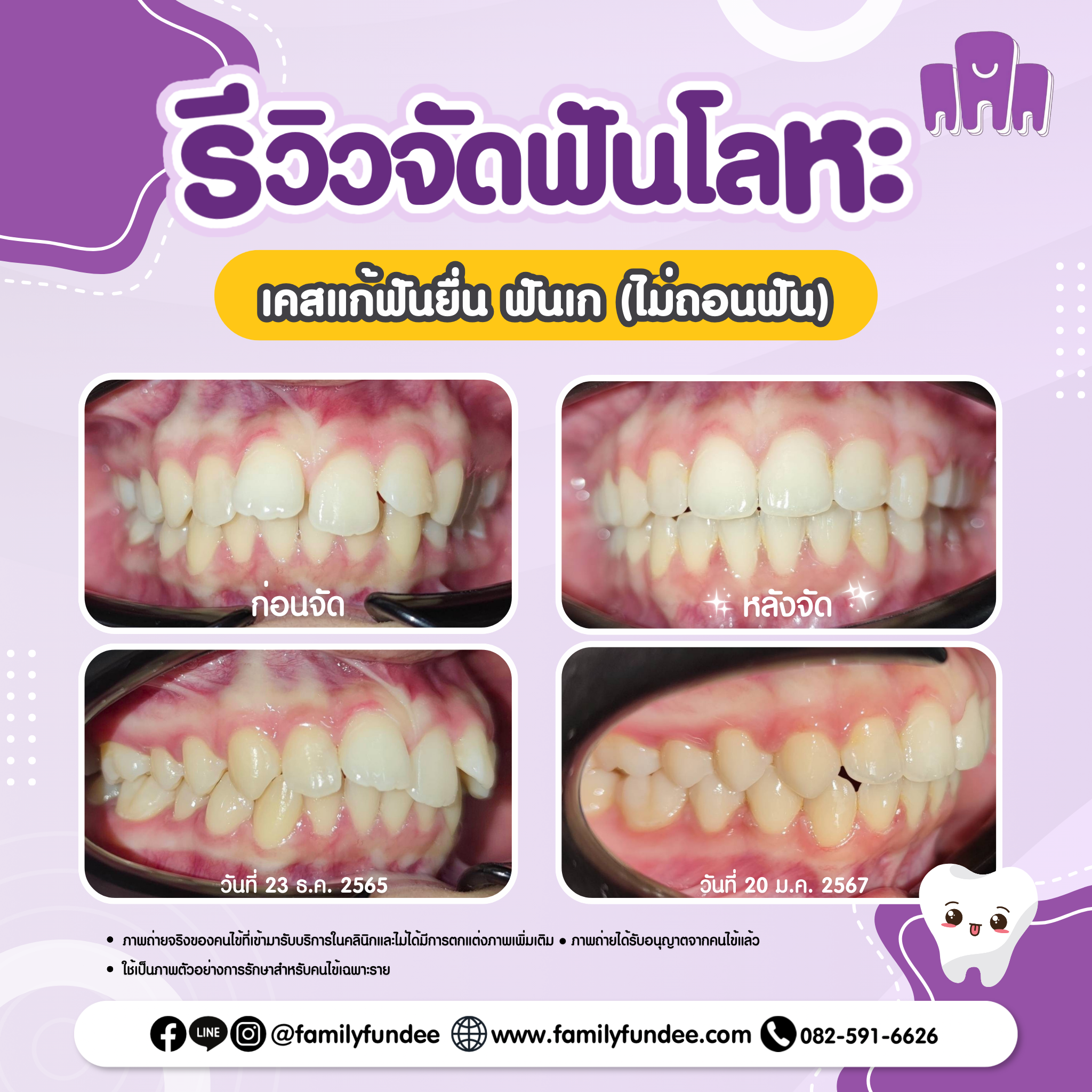 รีวิว จัดฟันลวด ผลลัพธ์การรักษาขึ้นอยู่กับแต่ละบุคคล รีวิวเคสจัดฟันเหล็ก จากผู้รับบริการจริง โดย คลินิกครอบครัวฟันดี ทั้ง 6 สาขา ในระยอง สอบถาม / ปรึกษา ผ่าน LINE